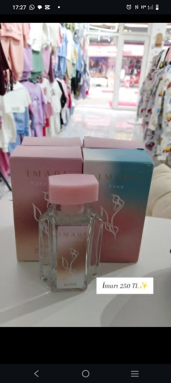 Avon İmarı kadın parfümü, pembe kapaklı şeffaf cam şişede ve pastel renkli kutuda sunulmaktadır. Fiyat: 250 TL.