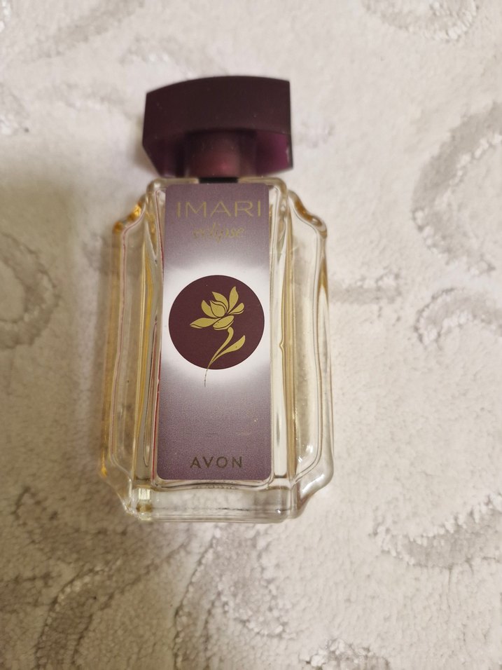 Avon Imari kadın parfümü, mor kapaklı şeffaf cam şişede çiçeksi koku sunar. Günlük kullanım için uygundur. ürün kullanıldı