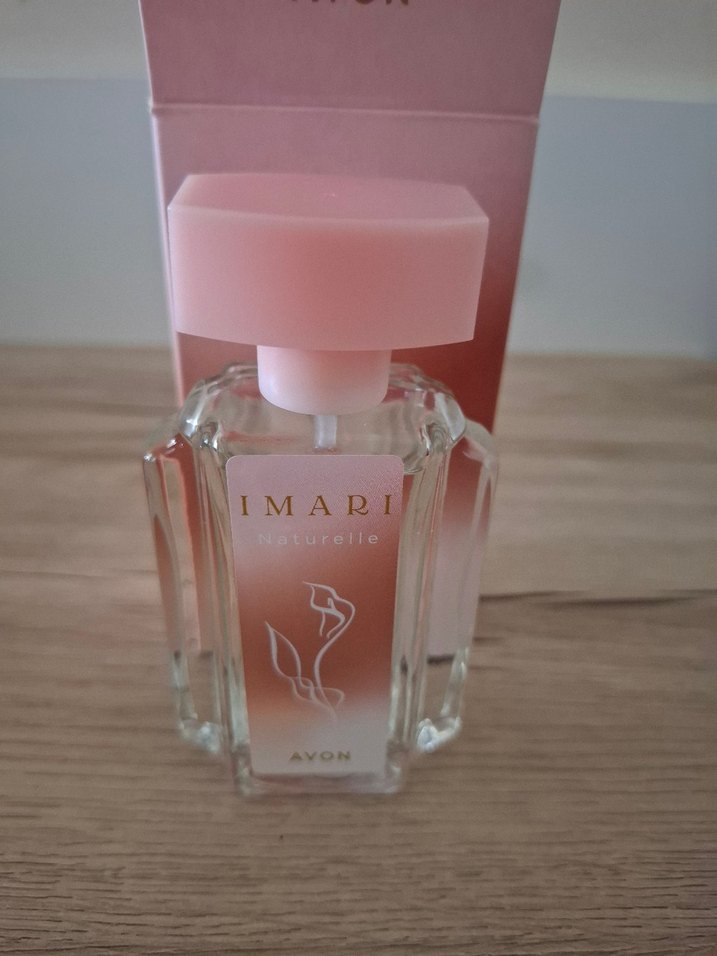 Avon Imari Naturelle kadın parfümü, pembe kapaklı şeffaf cam şişede yumuşak çiçeksi koku sunar. Zarif tasarımı hafif kokusunu yansıtır.