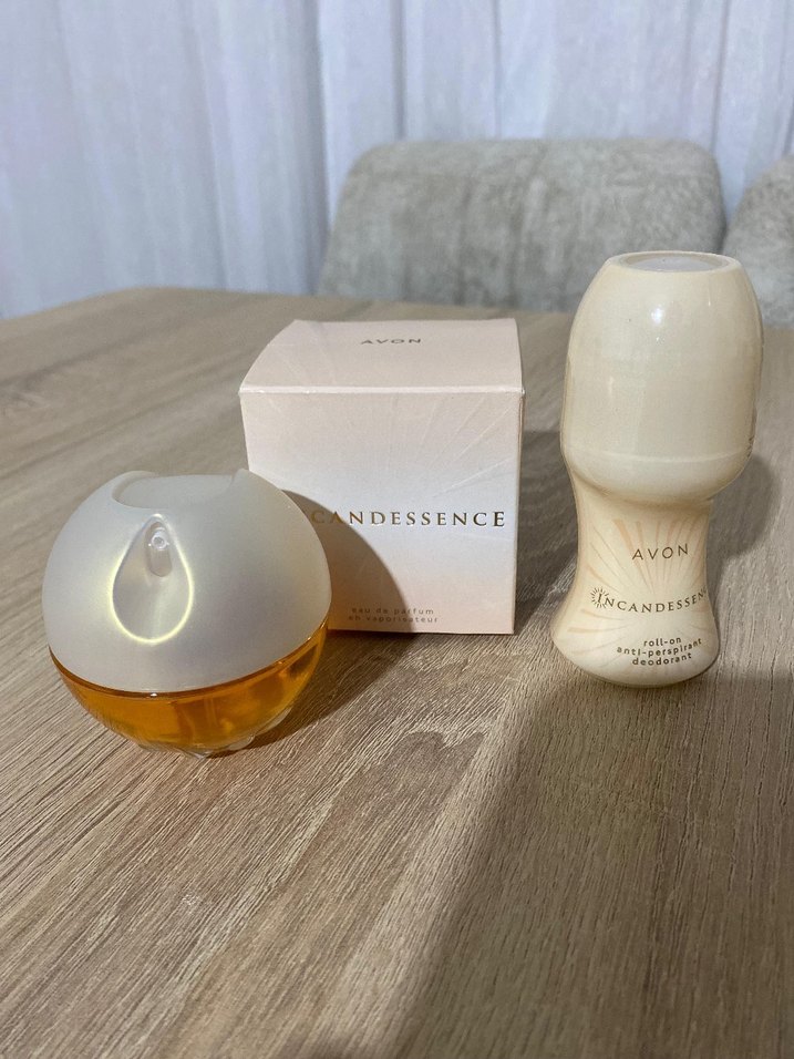 Avon Incandessence kadın parfüm seti, mat kapaklı yuvarlak şişe ve roll-on deodorant içerir. Sıcak ve zarif bir koku sunar.