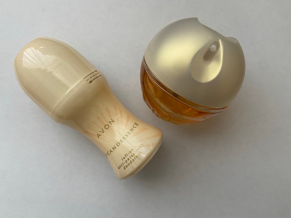 Avon Incandessence kadın parfümü ve roll-on deodorant, yumuşak ve hoş kokusuyla dikkat çeker. Parfüm şişesi yuvarlak ve şık tasarıma sahiptir.