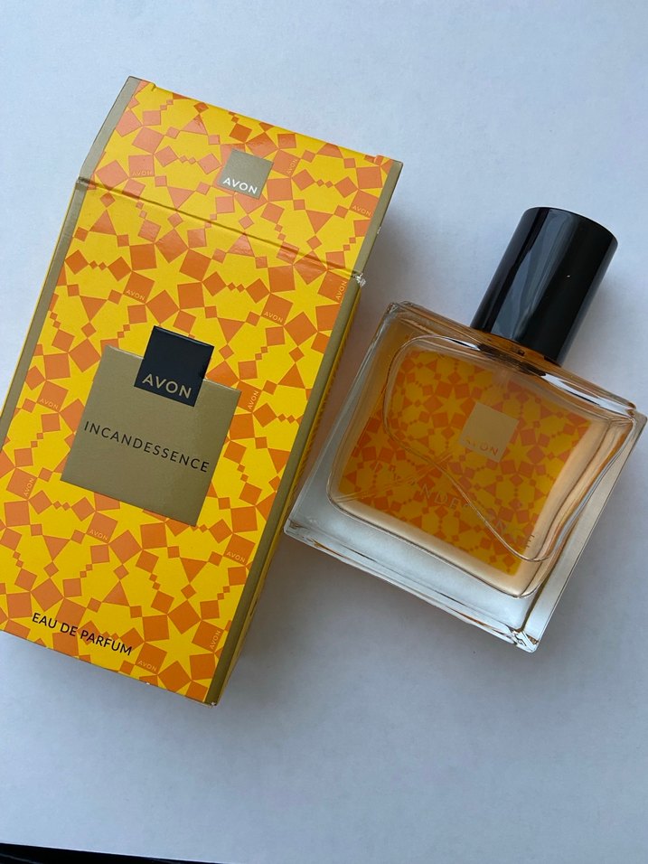 Avon Incandessence, sıcak ve canlı kokusuyla kadınlar için eau de parfum. Şişe ve kutuda turuncu ve sarı tonlarda parlak geometrik desenler bulunur.