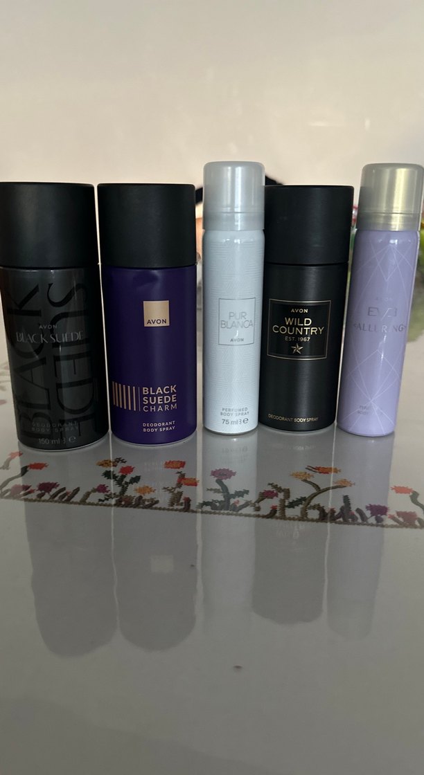Avon markalı 5 farklı kadın ve erkek deodorant spreyi seti. Black Suede, Black Suede Charm, Pur Blanca, Wild Country ve Eva Alluring kokuları bulunur. Sıfır, tamamının fiyatı