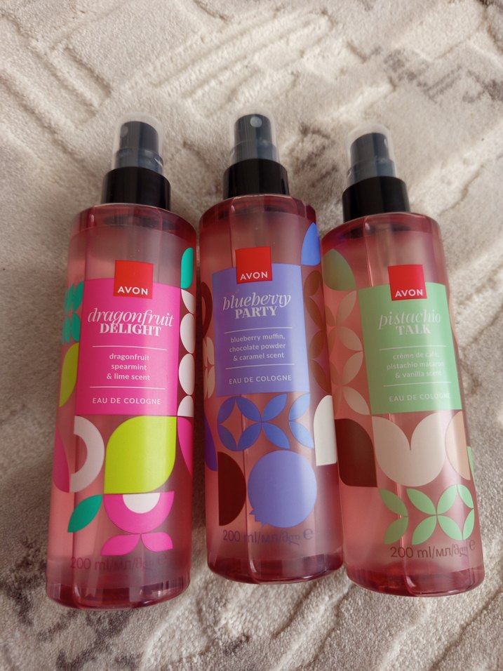Avon kadın kolonyaları, 200 ml şişelerde, dragonfruit, blueberry ve pistachio aromalı. Her biri farklı meyvemsi koku sunar.