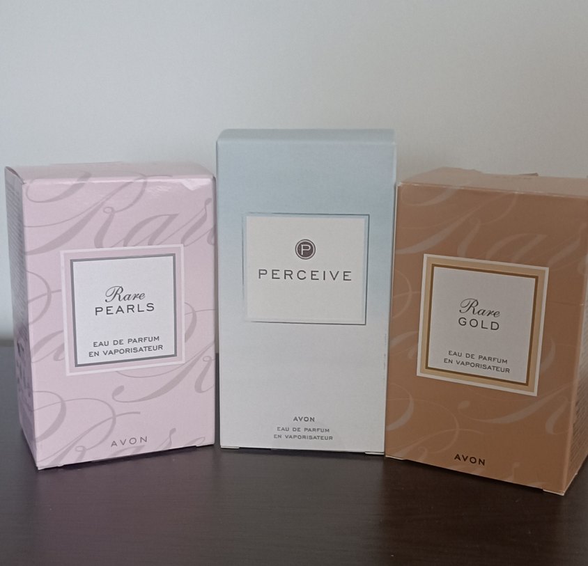 Avon'un Perceive, Rare Pearls ve Rare Gold isimli üç kadın parfümü seti. Her biri eau de parfum ve sprey formunda.
