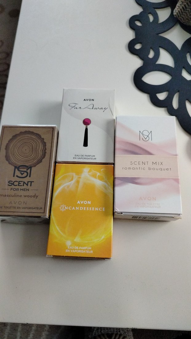 Avon markasına ait dört farklı parfüm seti; maskülen odunsu ve romantik buket gibi kokular içerir. Her biri sprey şişede sunulur.