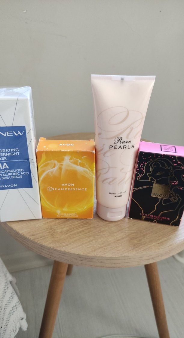 Avon Incandessence parfüm, Rare Pearls vücut losyonu ve diğer bakım ürünlerini içeren set. Her ürün farklı koku ve cilt faydaları sunar.