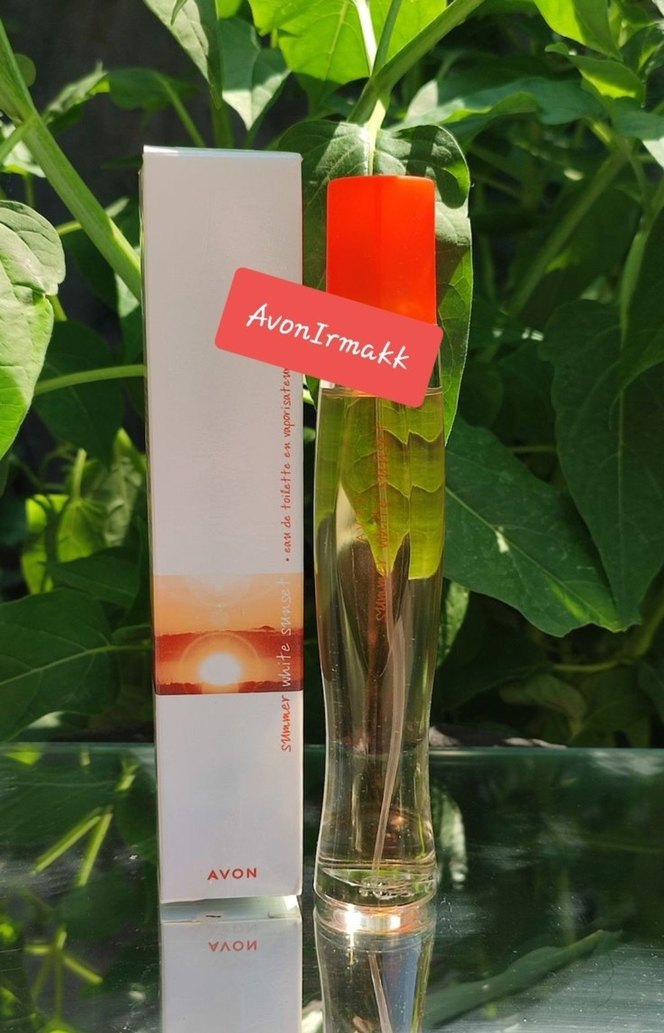 Avon kadın parfümü, şeffaf cam şişede turuncu kapaklıdır. Beyaz kutusunda gün batımı tasarımı bulunur.