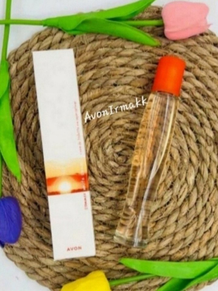 Avon markalı, turuncu kapaklı kadın parfümü. İnce şeffaf şişede, ferah ve zarif bir koku sunar.