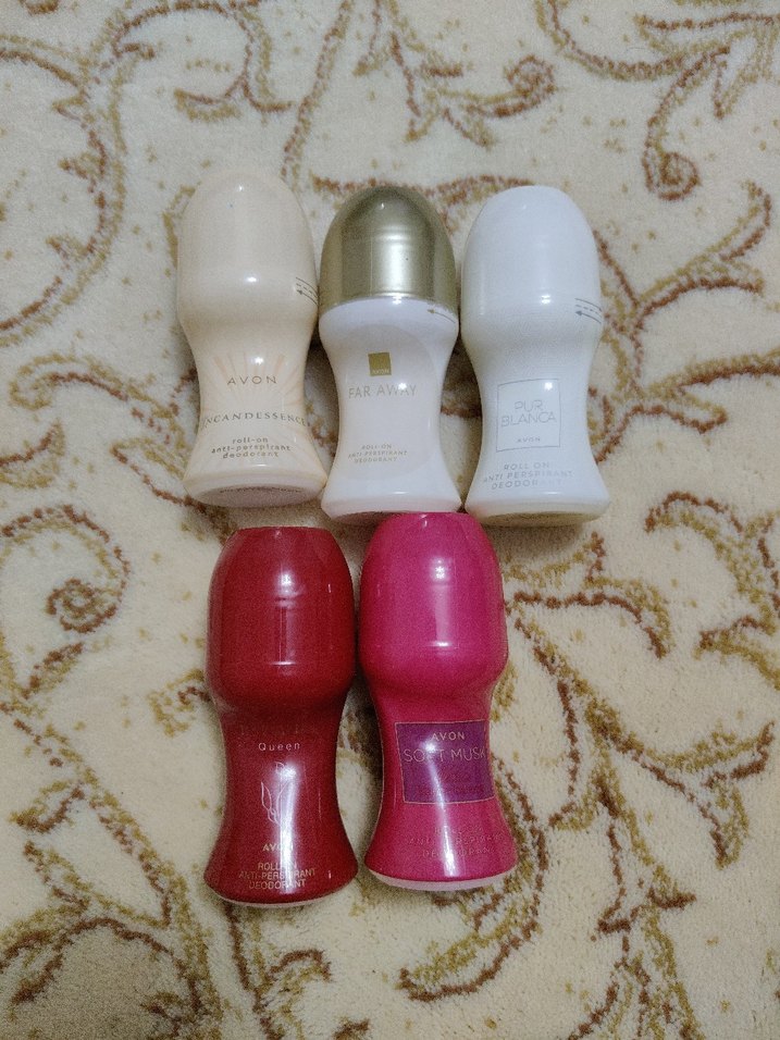 Çeşitli kokularda ve renklerde beş adet Avon kadın roll-on deodorant seti, etkili koku koruması sağlar.