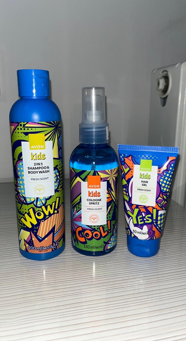 Avon Kids 2'si 1 arada şampuan ve vücut yıkama, kolonya spreyi ve saç jeli içeren taze kokulu çocuk seti. Üçlü set fiyatıdır