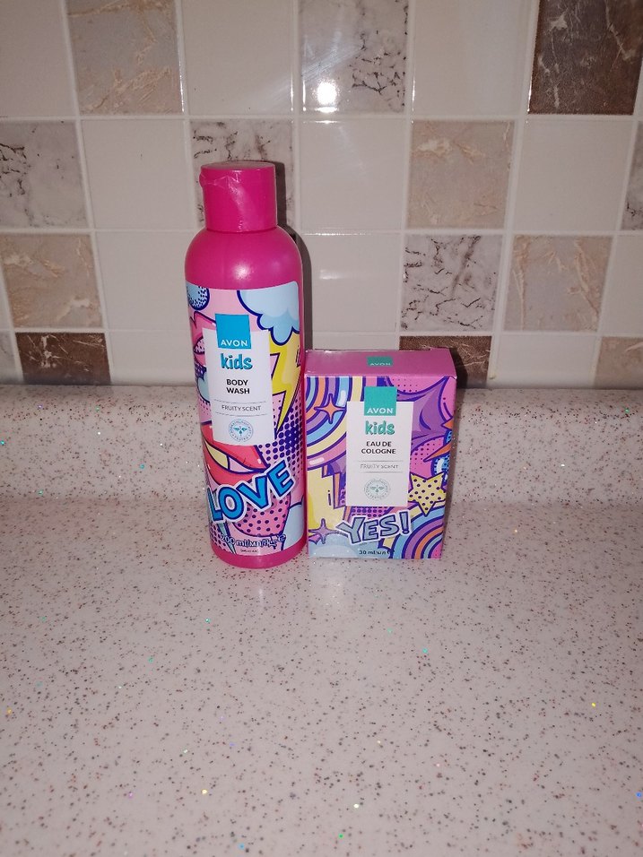 Avon Kids çocuk şampuanı ve kolonyası, renkli ambalajda sunulur. Şampuan saçları nazikçe temizler, kolonya hafif ve ferah koku sağlar.