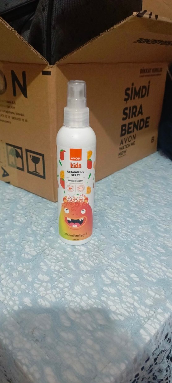 Avon Kids mango kokulu, düğüm açıcı sprey. Çocukların saçlarını nazikçe açmak için renkli turuncu şişede sunulur.