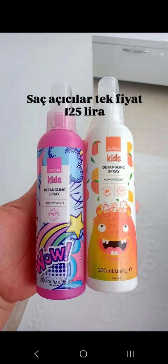Avon Kids meyveli ve mango kokulu 200 ml saç açıcı spreyler, 125 lira fiyatla. Saçların kolay açılmasını sağlar.