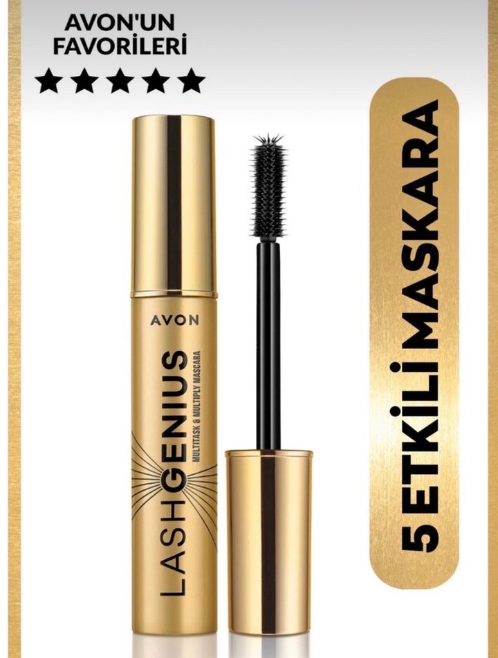 Parlak altın renkli Avon Lash Genius maskara, kirpiklere hacim, uzunluk ve belirginlik sağlayan 5 etkili formüle sahiptir.