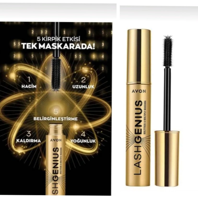 Avon Lash Genius maskara, parlak altın renkte, hacim, uzunluk, belirginleştirme, yoğunluk ve biçimlendirme dahil 5 kirpik etkisi sunar. ✨