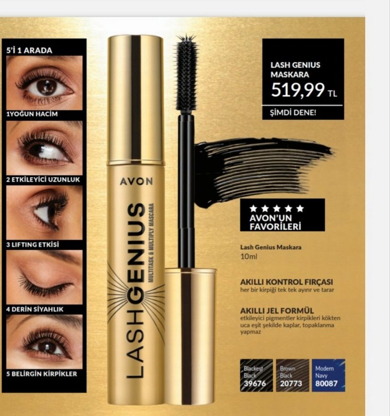 Avon Lash Genius maskara, akıllı kontrol fırçası ve topaklanmayan akıllı jel formülü ile kirpikleri kökten uca kaplar. Parlak altın renkli ambalajda, 10 ml.