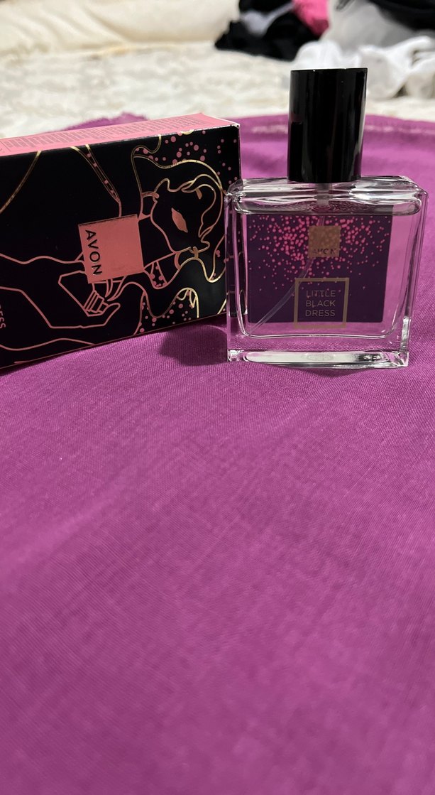 Avon Little Black Dress kadın parfümü, şeffaf şişe ve siyah kapaklı, şık siyah-pembe kutu tasarımıyla sunuluyor.