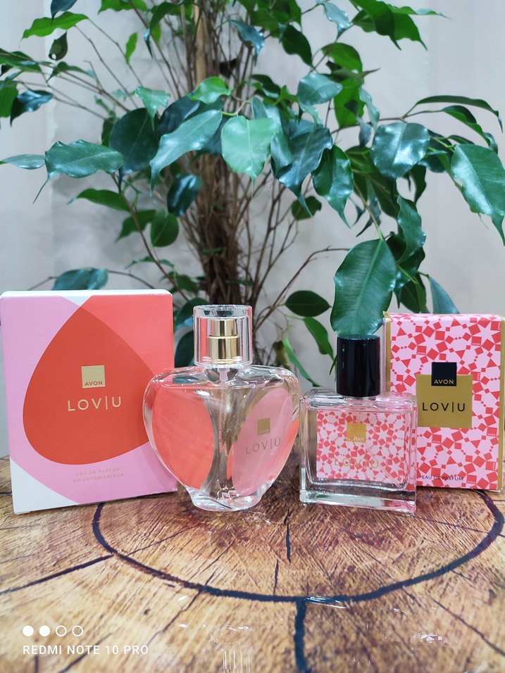 Avon Loviu kadın parfüm seti, çiçeksi ve ferah kokulara sahip iki şık şişe içerir. Ambalajları pembe ve mercan desenlidir.