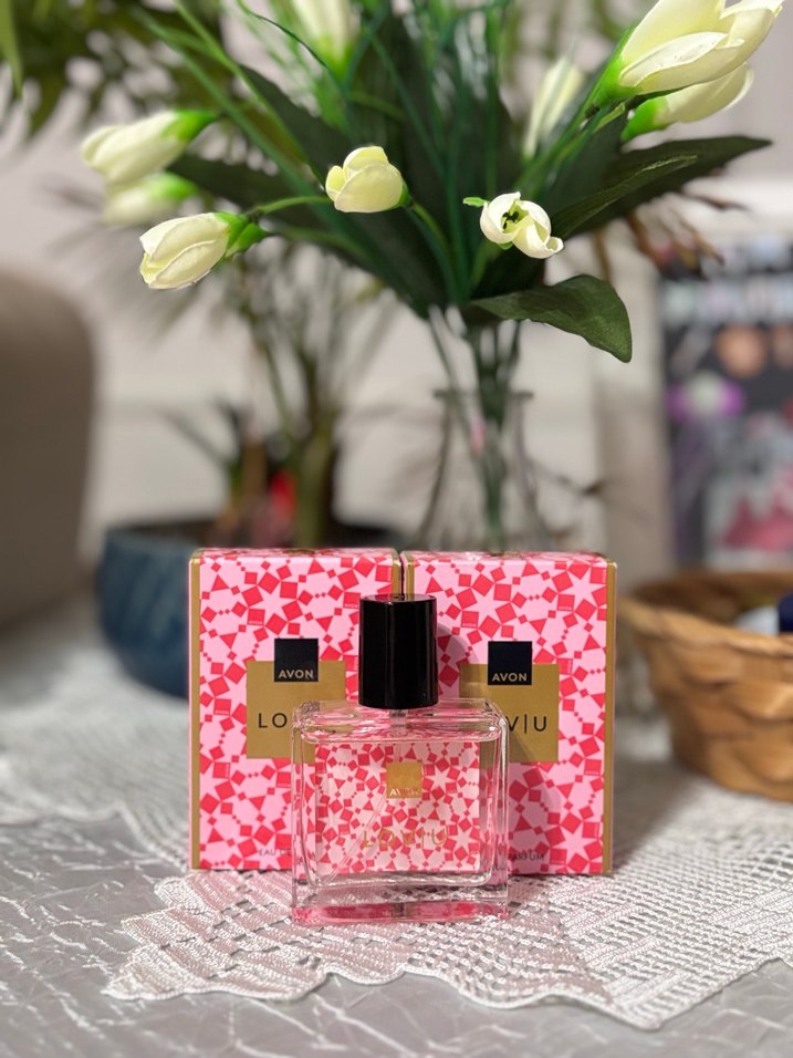 Avon Loviu kadın parfümü, 30+30 ml şişede, çiçeksi ve ferah kokulu. Pembe desenli kutuda sunulmaktadır.