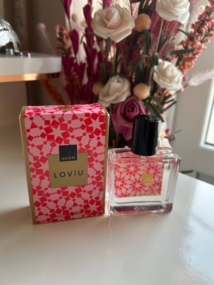 Avon Loviu kadın parfümü, pembe ve altın desenli kutusu ile çiçek temalı tasarıma sahiptir. Siyah kapaklı cam şişede sunulur.