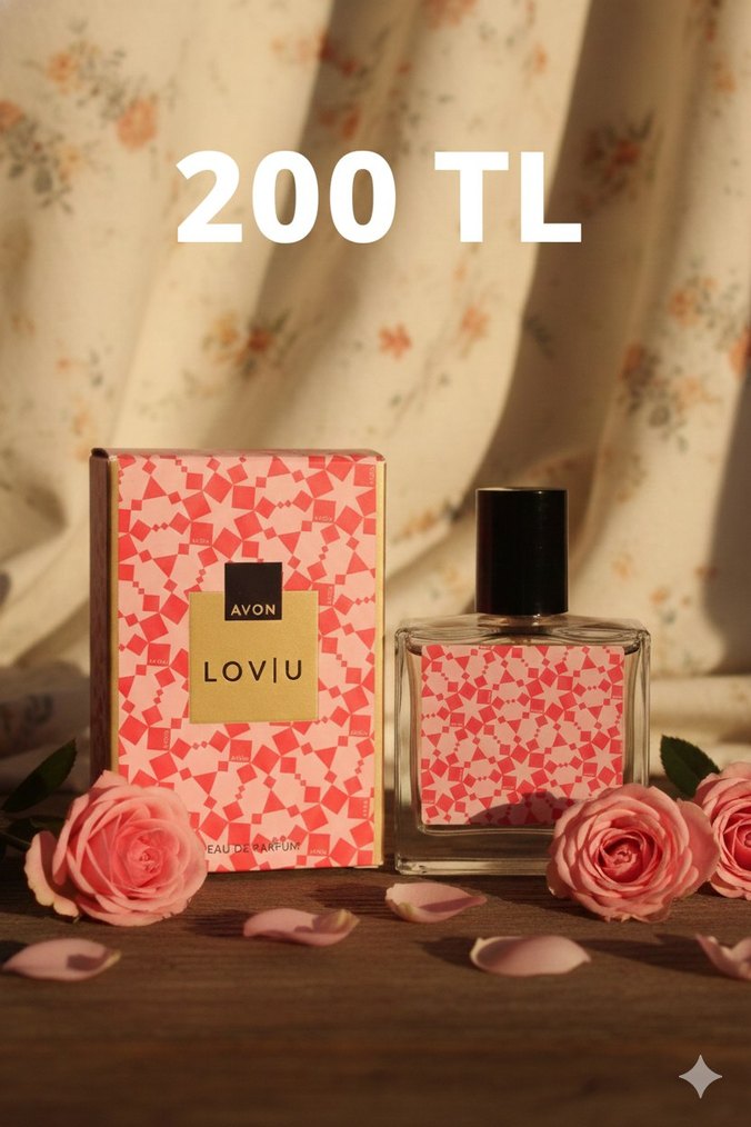 Avon Loviu kadın parfümü, 50 ml şişede ve çiçek desenli kutusuyla sunulmaktadır. Fiyatı 200 TL'dir.