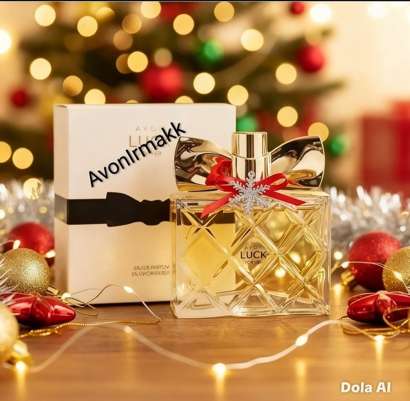 Avon Luck kadın parfümü, şık şeffaf şişesi ve kırmızı kurdele ile süslenmiş kar tanesi aksesuarı ile dikkat çeker.