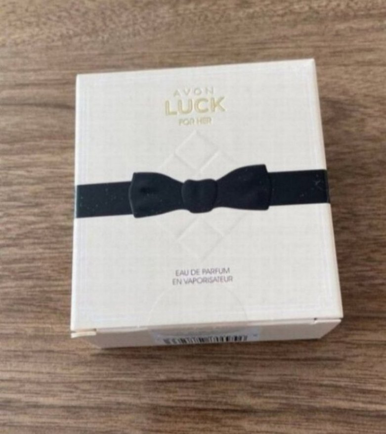 Avon Luck for Her kadınlar için sprey şişede eau de parfum. Beyaz kutuda siyah fiyonk detaylı parfüm