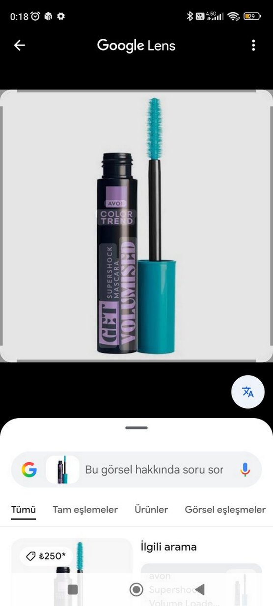 Mavi fırçalı, koyu mor Avon maskara, kirpiklere hacim kazandırmak için tasarlanmıştır. Get Volumisky Supershock Maskara etiketi bulunur.