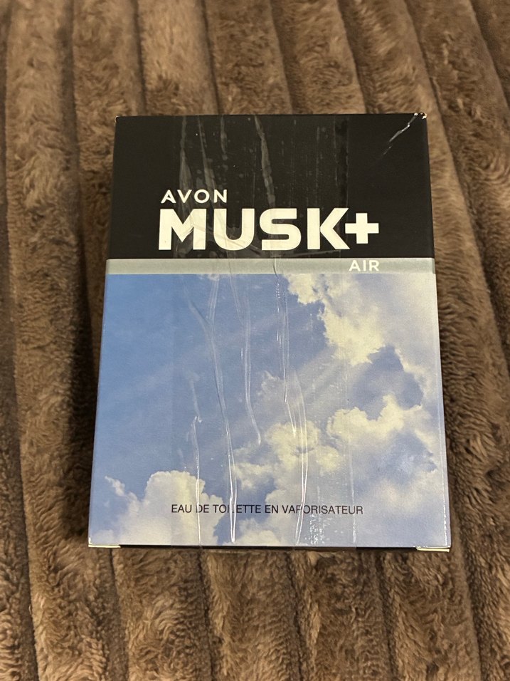 Avon Musk+ Air, parlak kahverengi kutuda erkekler için avant-garde tarzda bir eau de toilette. Markanın ve ürünün bilgileri kutuda yer alır. ️