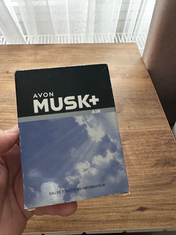 Avon Musk+ Air, parlak mavi ambalajda vintage tarzda erkekler için musk kokulu eau de toilette. ️