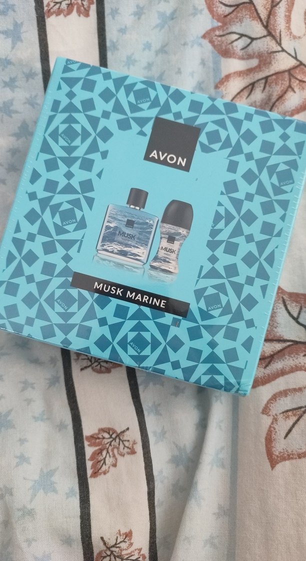 Avon Musk Marine erkek parfüm seti, canlı mavi ve gri renklerle bohem Paris tarzını yansıtıyor. Sprey ve roll-on içerir.