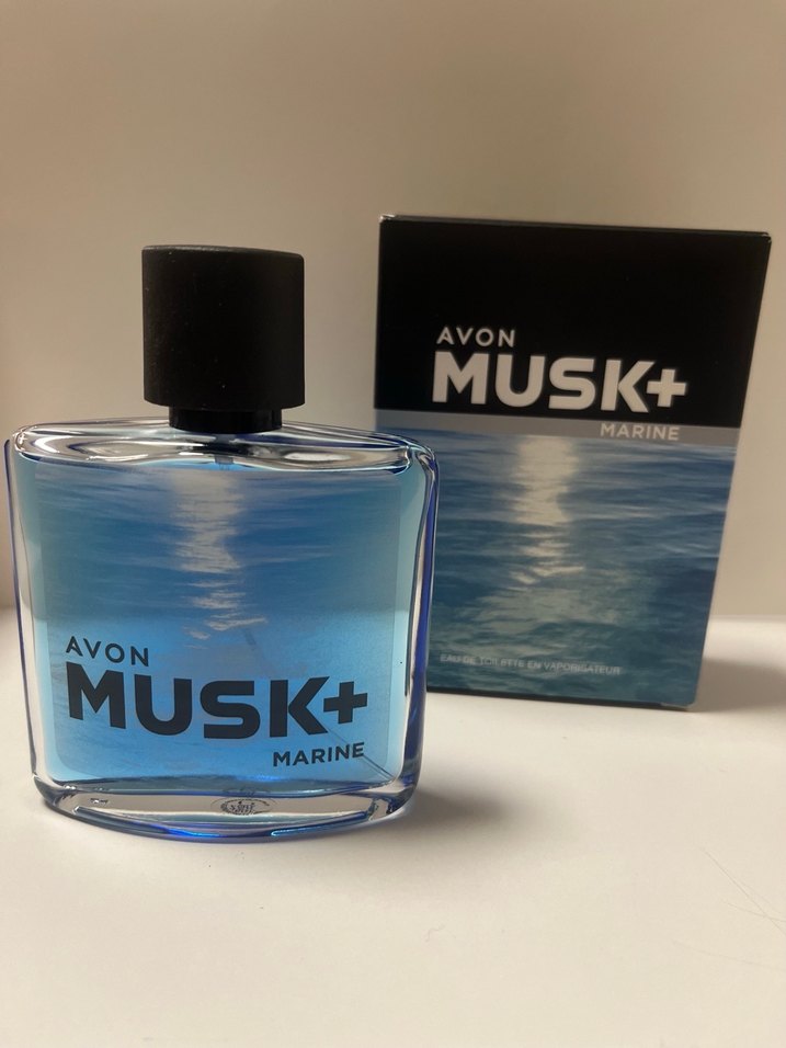 Avon Musk+ Marine erkek parfümü, parlak mavi şişede ferah ve su temalı bir koku sunar. Sıfır kutusunda.