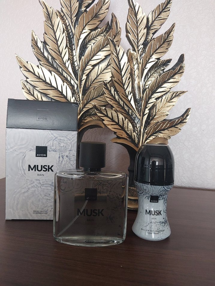 Avon Musk Rain erkek parfümü modern klasik tarzda, minimalist gri tasarıma sahiptir. Set, sprey şişe ve roll-on deodorant içerir.
