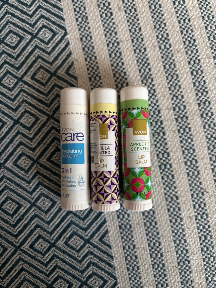 Avon markasına ait nemlendirici 3'ü 1 arada, vanilya ve elma aromalı dudak balmı seti, dudakları nemlendirir ve hoş koku sunar.