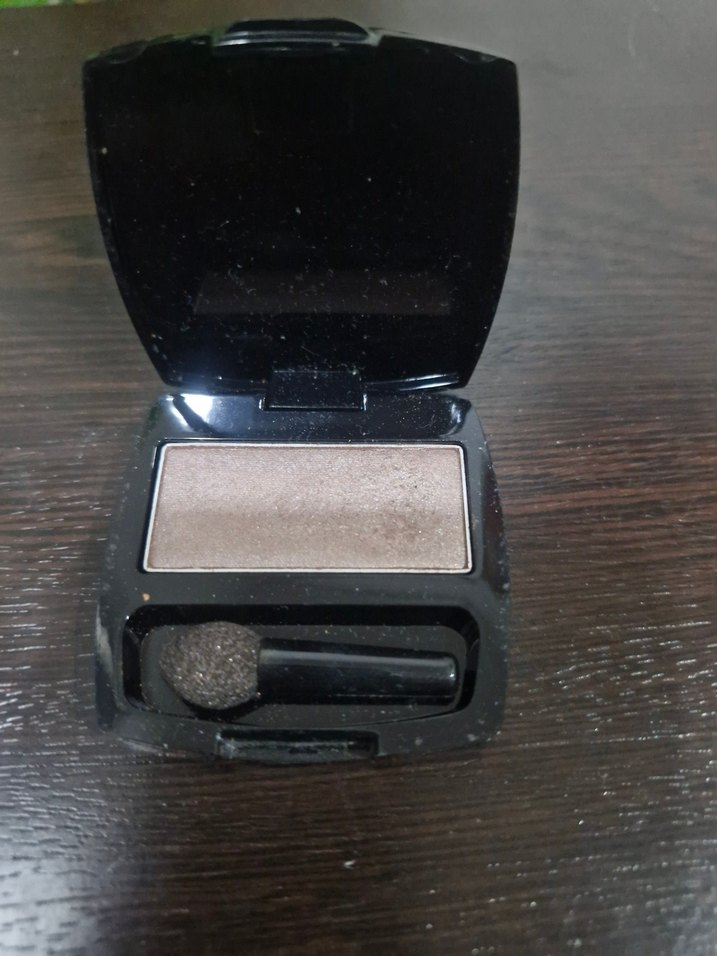 Avon logosu bulunan parlak siyah kompakt kutuda açık kahve rengi göz farı. Şık tasarıma sahip.