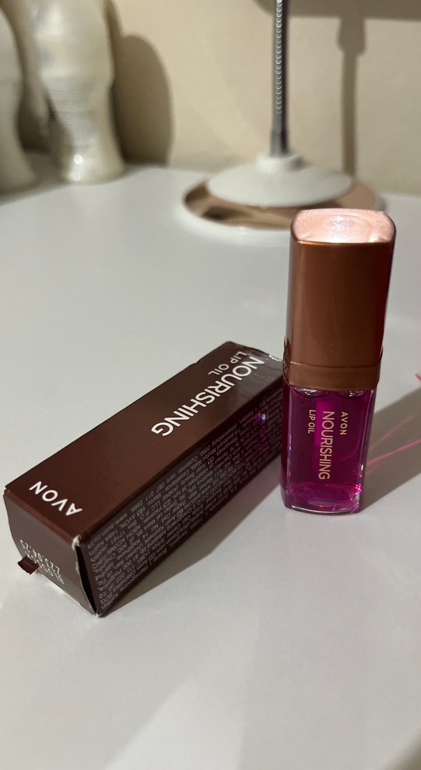 Avon markasına ait LIPOIL yazılı, parlak kahverengi dudak parlatıcısı, besleyici formüle sahiptir.