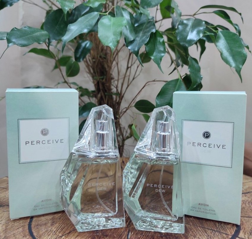 Avon Perceive Dew kadın parfümü, şeffaf ve benzersiz şekilli cam şişede, mint yeşili kutusunda sunulmaktadır. Ferah ve hafif bir kokuya sahiptir.