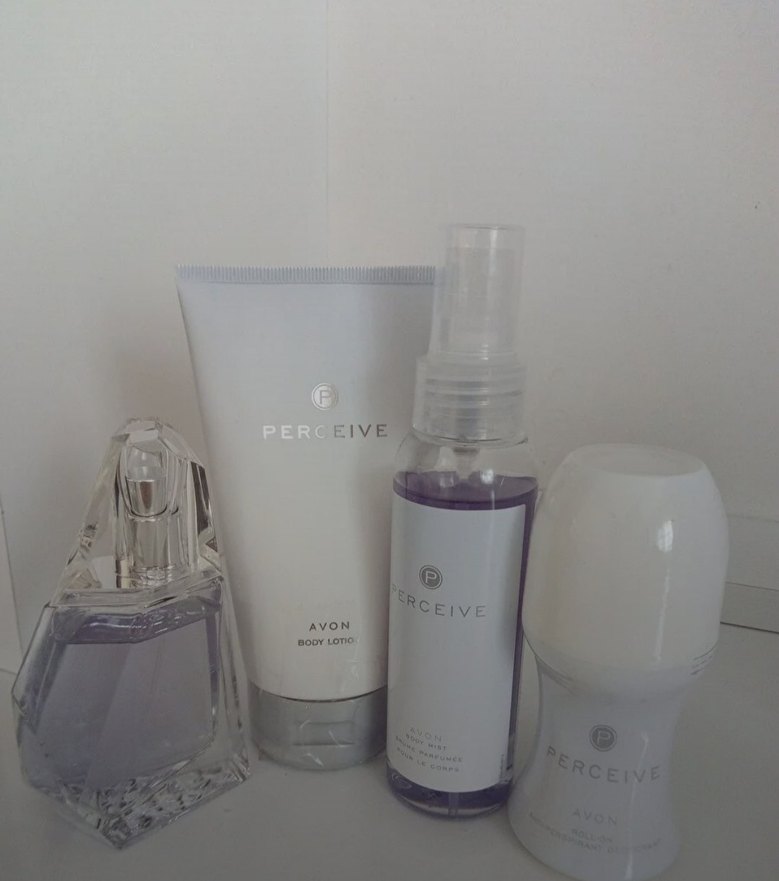 Avon Perceive kadın parfüm seti; parfüm şişesi, vücut losyonu, vücut spreyi ve roll-on deodorant içerir.
