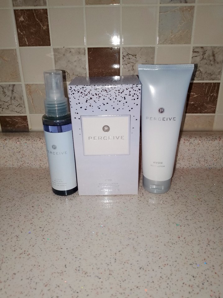 Avon Perceive kadın parfüm seti, sprey şişe, kutulu parfüm ve losyon tüpünden oluşur, açık mavi renktedir.