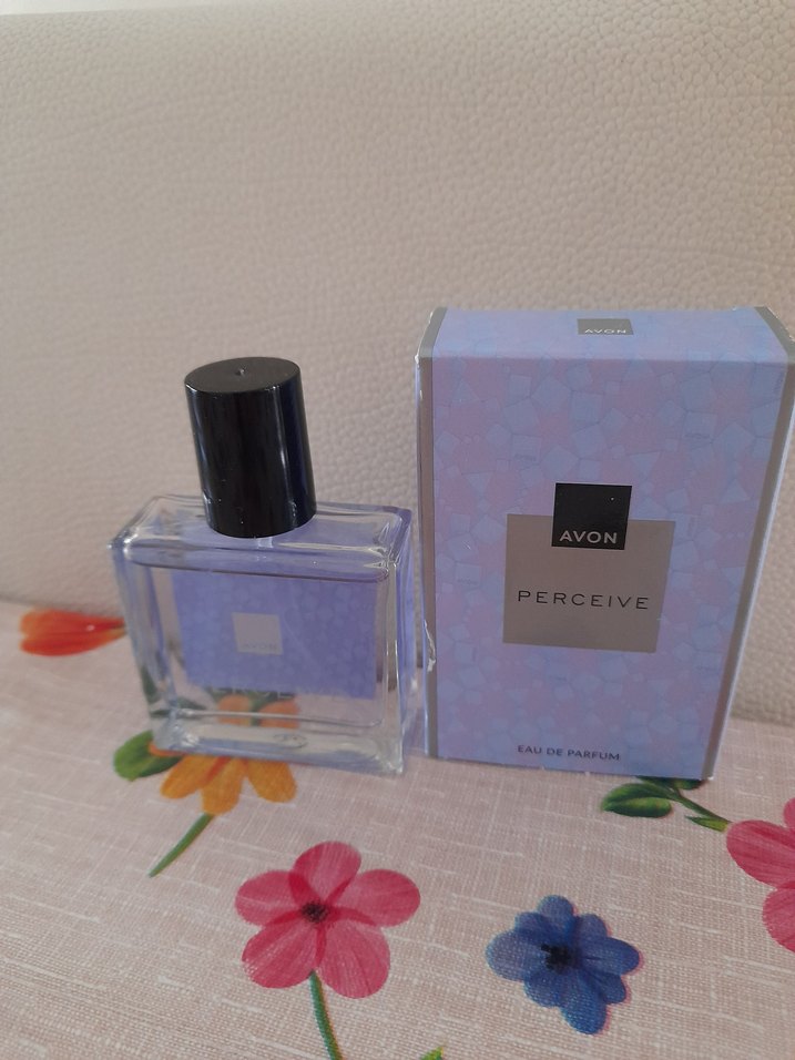 Avon Perceive kadın parfümü, siyah kapaklı şeffaf cam şişede, hafif mor desenli kutusuyla taze ve zarif bir koku sunar.