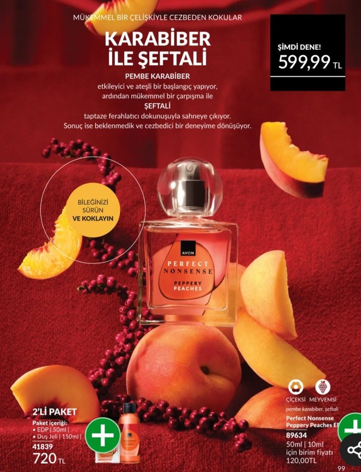 Avon Perfect Nonsense, karabiber ve şeftali kokularını birleştirerek taze ve cezbedici bir koku sunar. 50 ml ve 150 ml olmak üzere 2'li paket halinde.