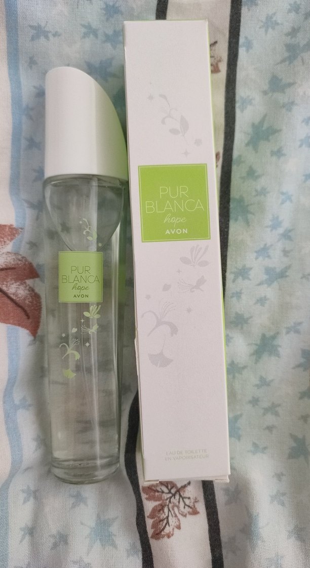 Avon Pur Blanca Hope kadın parfümü, taze ve çiçeksi kokusuyla şık cam şişede sunulur. Orijinal beyaz ve yeşil kutusuyla birlikte.