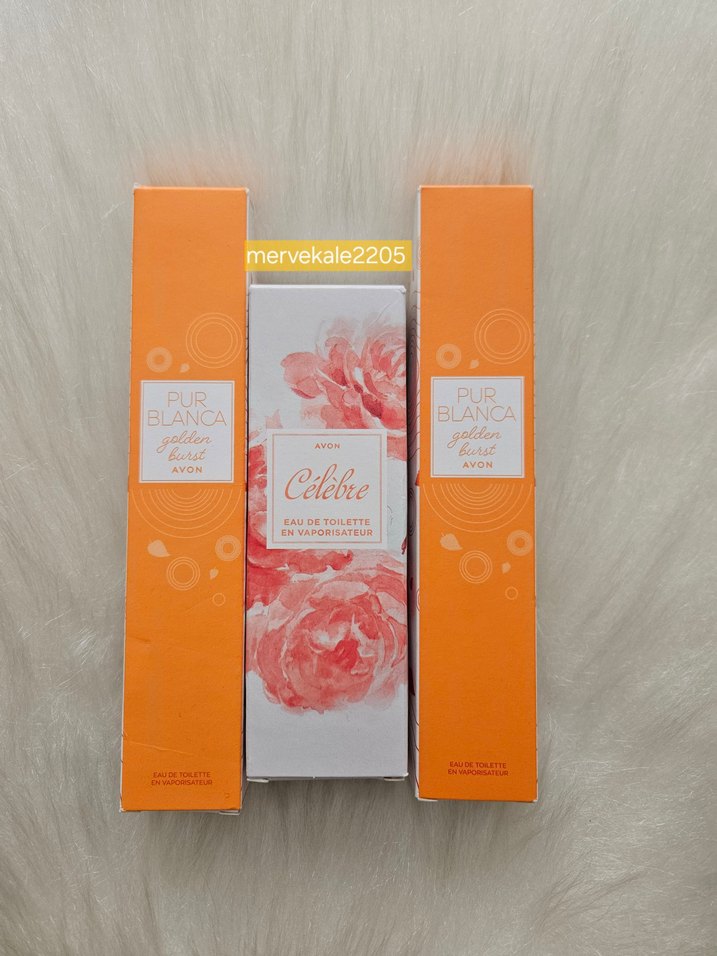 Avon Pur Blanca ve Celebre Eau de Toilette kadın parfümleri, canlı ambalajlarıyla taze ve çiçeksi kokular sunar. toplam 3 ürün fiyatıdır