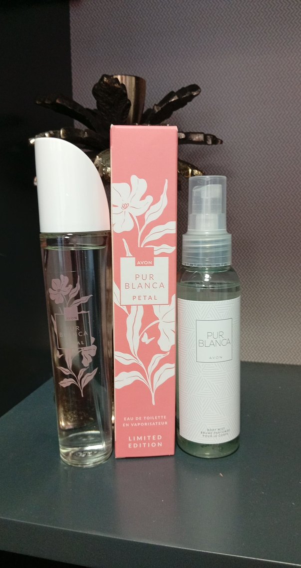 Avon Pur Blanca Petal kadın parfümü, şişede çiçek desenli ve pembe kutuda. Sınırlı sayıda üretilmiştir.