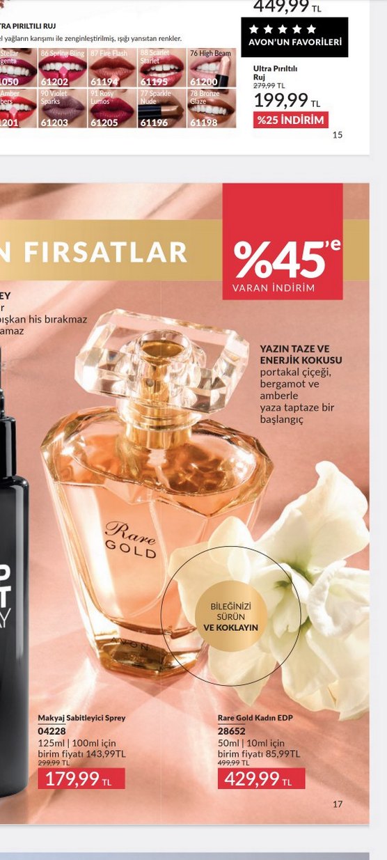 Avon Rare Gold kadın parfümü, portakal çiçeği, bergamot ve amber notalarıyla taze ve enerjik bir koku sunar. Yaz için ideal, bileğinize sürüp koklayın.