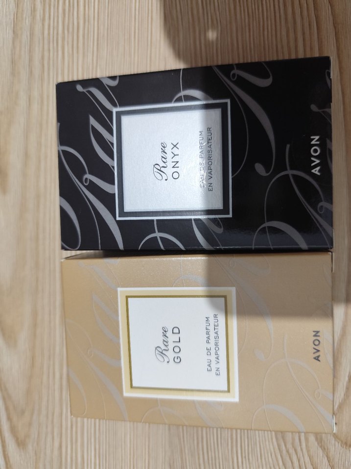 Avon Rare Onyx ve Gold kadın parfümleri, şık siyah ve altın renkli kutularda. Her biri Eau de Parfum konsantrasyonunda, farklı koku deneyimleri sunar.