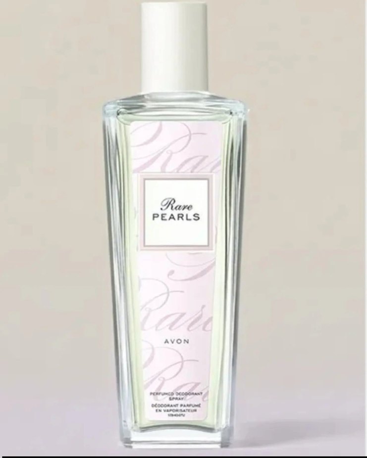 Avon Rare Pearls kadın parfümü, beyaz kapaklı şeffaf cam şişede, zarif ve hafif bir koku sunar.