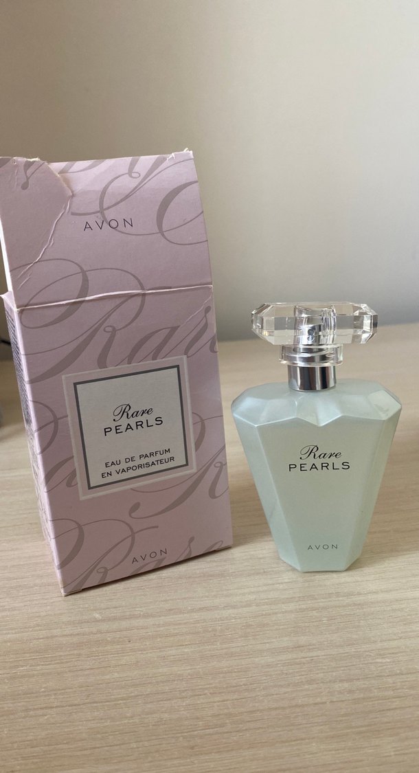 Avon Rare Pearls kadın parfümü, keskin hatlara sahip şişesi ve şeffaf zarif kapağı ile. Orijinal kutusunda. Eau de Parfum.