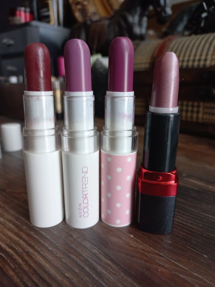 4 adet Avon ruj..Görüldüğü gibi gayet iyi durumda ve temizler..Numaralarini fotografladim sadece açik pembe ambalajli olanın alt numarası yok.